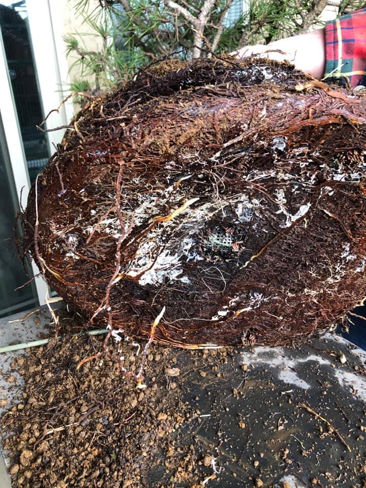 Austrian Black pine root platter. Lots of healthy mycorrhiza in the bottom of the pot. Very little soil existed as the roots had push most of it out. I had to remove the entire bottom root platter to give space for new development.